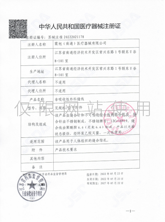 非吸收性外科缝线获得江苏省药品监督管理局(JSDA)医疗器械注册证